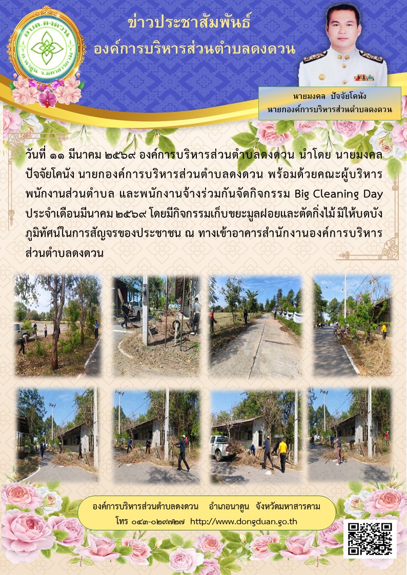 วันที่ 11 มีนาคม 2569 องค์การบริหารส่วนตำบลดงดวน นำโดย นายมงคล ปัจจัยโคนัง นายกองค์การบริหารส่วนตำบลดงดวน พร้อมด้วยคณะผู้บริหาร พนักงานส่วนตำบล และพนักงานจ้างร่วมกันจัดกิจกรรม Big Cleaning Day ประจำเดือนมีนาคม 2569 โดยมีกิจกรรมเก็บขยะมูลฝอยและตัดกิ่งไม้ มิให้บดบังภูมิทัศน์ในการสัญจรของประชาชน ณ ทางเข้าอาคารสำนักงานองค์การบริหารส่วนตำบลดงดวน
